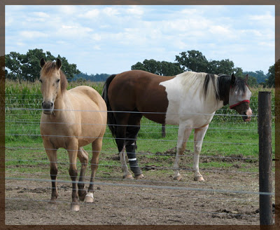 In the late morning today I went out to check on Steen. I found him standing with weight on the injured leg, and was initially impressed that he did not try to move away from me when I reapplied the pink stuff to his three unwrapped wounds. Then I decided it would be best to get him to walk around a little, and upon haltering him and asking him to accompany me over the water tank, I discovered that he was extremely reluctant to move at all. He’d move his front feet and sort of pivot but he really, really didn’t want to pick either of his back legs up, and when he finally did, he picked them up one at a time and kind of kicked with them in the air behind him, but refused to move forward. I kept pestering him until he took two steps, and after that he followed me slowly but willingly.