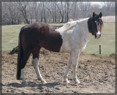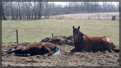 and me out on our first real ride of the season in the company of Jean and Schooley. The horses were pretty calm starting off, and the sun was out, there was a nice breeze and it felt good to be in the great outdoors. We meandered around the property for a while, the only incident being the startling emergence of a wild turkey in the underbrush. Steen bolted but didn’t stay freaked out after I brought his brief dash to a halt.