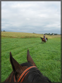 First I met Jean at the barn in the morning. We tacked up Steen and Schooley and headed out. Things started out very low-key, but when we turned around to head back up the grassy strip between corn-fields we often use as a warm-up, we decided to trot for a bit. Steen wanted to go faster than a trot. When I didn’t let him, he started to crow-hop.