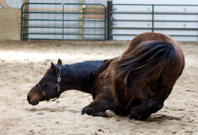 Brian and I have now officially been married for two whole years, so we decided to celebrate by spending the early afternoon at the barn. It is warmer today, though still super mucky, but we brought the boys in and cleaned them up. We wanted them to run around a little in the indoor arena but they mostly just wanted to stand around. Finally, Bear did deign to roll. He tries to be dainty but he doesn’t always pull it off: