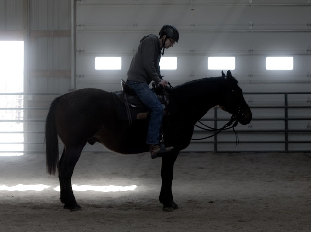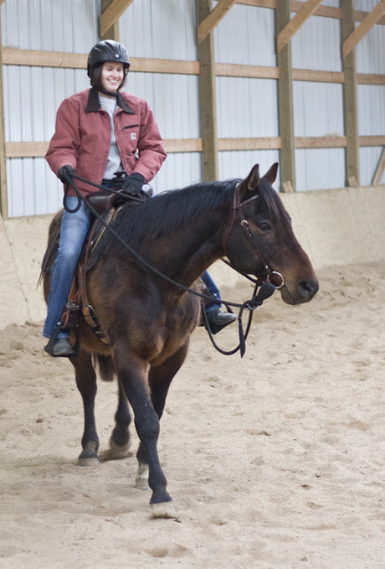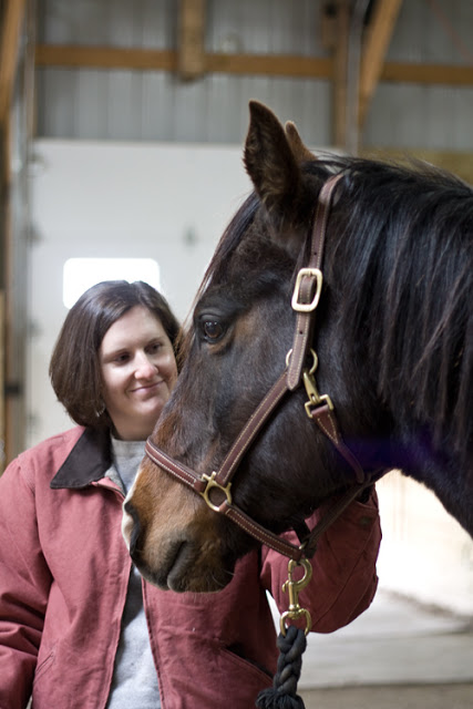 Sunday we went back out to the barn and again it was empty (most of the boarders were at a show). It was a much warmer and calmer day, and we found many of the horses snoozing in the pasture. We decided to just bring Steen inside at first and see if he was up for letting Christy ride him.