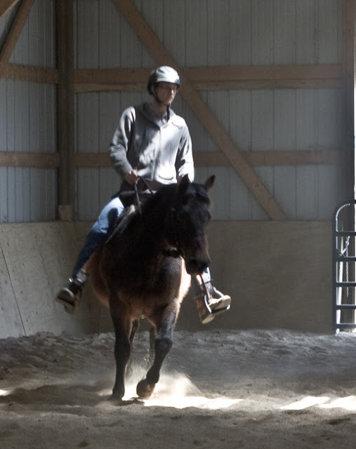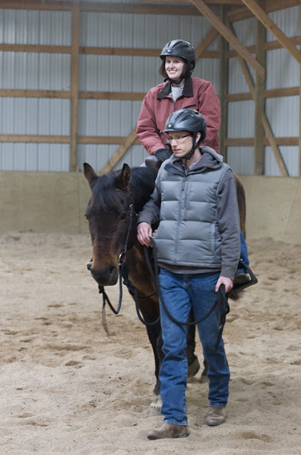 Steen was a completely different horse than yesterday. He was about as mellow as I’ve ever seen him. So we groomed him up and let Christy hop on. Again, she did great. Steen is not at all inclined to challenge a rider like Bear will, so he was quite willing to let her steer him around the arena. A few times he wanted to go to Robin in the middle, but Christy was able to keep him on the rail. Robin will have some photos of them on her blog.