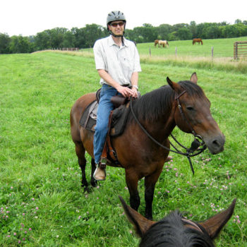We would work on some leg yielding at the bottom and then walk back up the strip towards Robin and Steen. Of course this would excite Bear and he would occasionally hop into the trot. I would gently steer him back the other way until I got a forward moving smooth trot, and then we’d try to walk back to the top of the strip. He got the idea eventually, though he would also start veering on the way back up the strip. Mostly he would veer away from certain “scary” patches of purple flowers or veer towards his herd on the other side of the fence. I did my best to keep him straight with my legs. For the most part it worked.