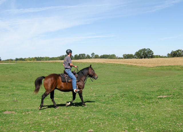 My ride was excellent. Bear was responsive when we did serpentines and backs and back turns, and he was totally willing to go with me to the far ends of the pasture so I could pretend to check the fences. That is until we got a little too close to home (or a sometimes stopping point) and I then turned him back down into the low part of the pasture so we could keep riding. That didn’t make him happy.