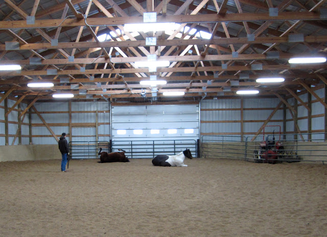 But today I was more than ready to get back out there. Brian and I decided we would go after work, no matter what, and I spent the whole day looking forward to it. After we got to the barn and brought the horses in, we turned them out for a few minutes inside. The pasture is icy, and sometimes when their movement is more confined outside they get a kick out of tearing it up in the indoor. Mostly this time they just wanted to roll.