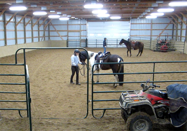 When we were riding on Tuesday, Bear got big compliments from another boarder when Brian realized just before mounting that he’d forgotten his spurs. So he left Bear in the arena while he went back for them. I was already riding, and Bear stood quietly without budging an inch until Brian got back. The boarder who saw this was impressed, which got Brian and I speculating whether or not Steen would do the same thing.