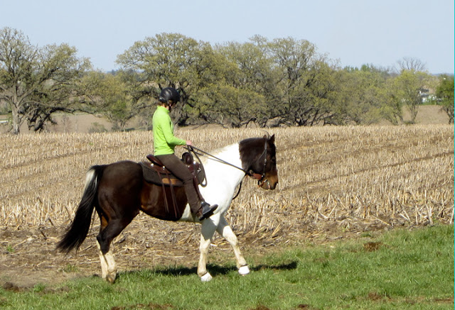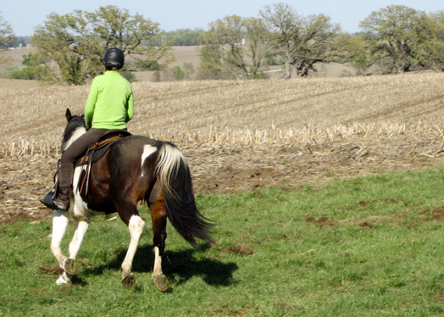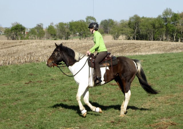 We walked and trotted for a while, then moved into the lope. At first Steen got the wrong lead going left again, but only once. After that we changed directions frequently and he had no more trouble. He kicked himself twice, but I could feel his boots absorb the bulk of the impact. The first time he stalled just a tad when he did it. The second time he didn’t even break stride. So that is a big improvement as always before the kicks have led to stumbles and some emotional upheaval.