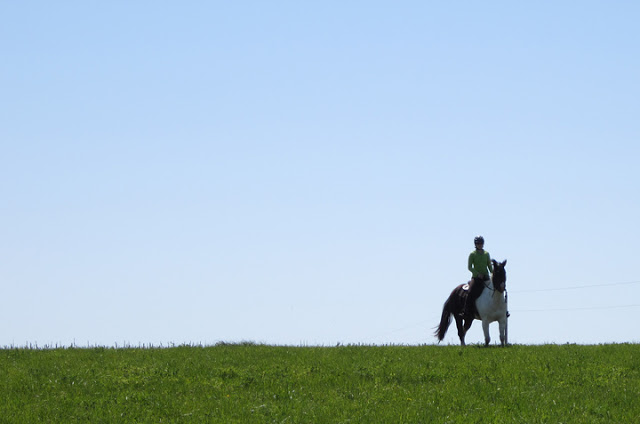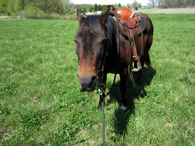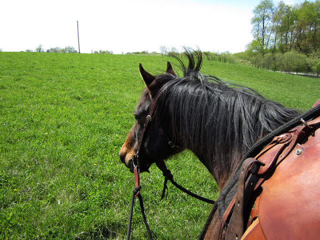 Today we went out for a fairly long (for us) trail ride. It was an absolutely gorgeous day. We received a little cold rain yesterday, and that helped green things up some. But today was in the low 60s with a bright, blue sky.