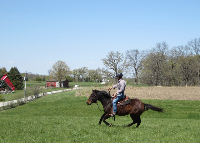 When we got back to the strip Robin and I each took a turn doing a little loping. It is nice to take advantage of their slightly tired state, and we also like the idea of reminding them that they still have to work and pay attention even when we get home. Bear and I started off with some decent lopes to the left. He was trying to get out of it a few times, but eventually I got to where he would keep going in a soft manner.