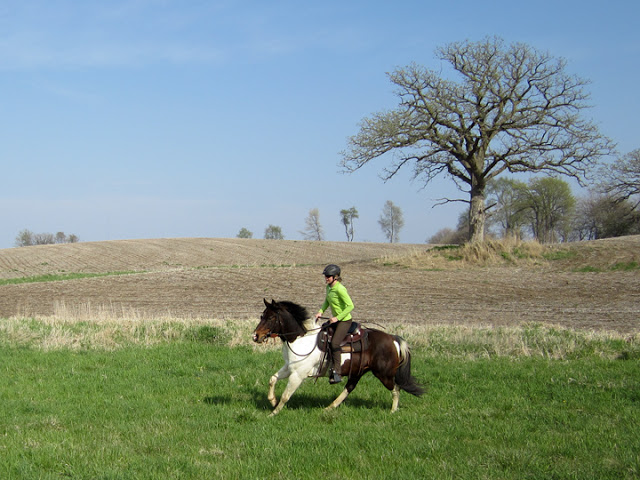 After the trim we headed out to wander around the fields a bit. The ride was going great. It was quite warm, and everyone was mellow. We went up and down the second strip, over to the three hills, and back down to the grassy area I’d loped the day before with such excellent results. So this is what I was envisioning would happen when I asked Steen to lope a circle: