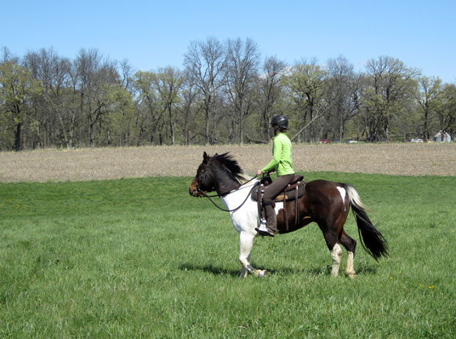 When we got to the scary double-track, I made sure to sit deep and keep my legs on him, nudging him forward when he balked. We made it through with a record low of hesitations and spring-loads. He did get a little keyed up a minute later on the road when a friend leaving the barn drove by slowly, talking to us with the window down. A car had just whizzed by at 25mph ten seconds earlier, and that didn’t bother Steen a bit. This is typical Steen atypicalness. I kept up my sit deep, legs on strategy. We made it off the road and soon he was walking quietly again. In the salad bowl, things were good. I spent a lot of time working on transitions between the walk and the trot. Steen was flipping back and forth between collecting much better than normal and trotting around with his head sticking up.