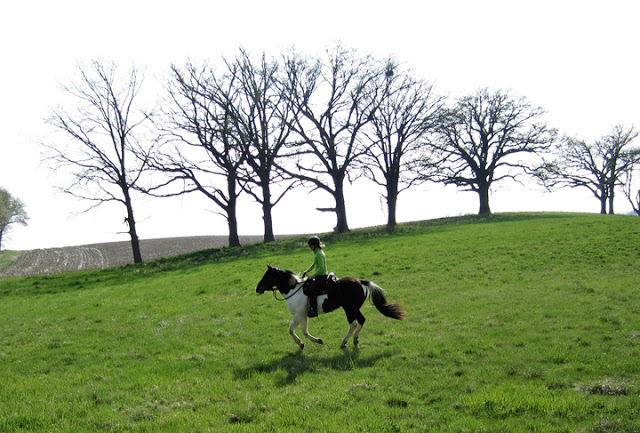 After the three hills, we went back up the second strip to the far end, where there is a nice grassy, flattish area we sometimes use to work the horses. Bear was tired today, so Brian just let him rest, but I decided to see how Steen would lope. And I have to say, in spite of all our recent forward progress, I was a tad surprised that he moved into the gait easily and did several laps in each direction at a very controlled but energetic pace. I easily steered him in a nice large circle, mostly using my legs and he never felt  like he was trying to run away with me. They weren’t perfect circles, but they were better than I expected.