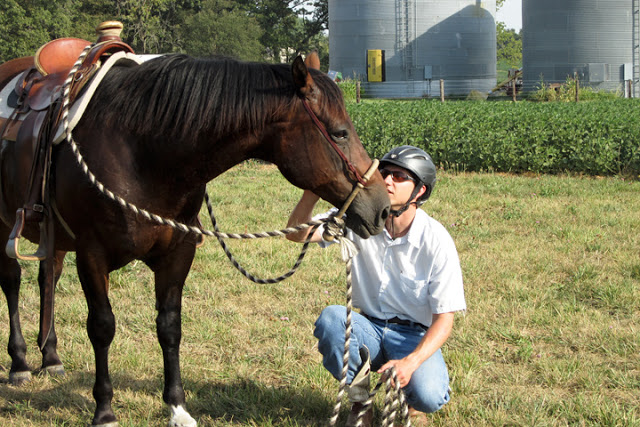 We then spent a few minutes watching Robin and Laredo trot around. They both looked great. Laredo has been experiencing some big chipping in his front hooves, so we were happy to see that he is not really bothered by that. Robin said he was so smooth and attentive she wanted to end on that note and she hopped off. Things were good with Bear and I, so I was ready to end the ride, too. But I also wanted to do just a little more work with no hands. I think it is a good way to begin and end our rides.