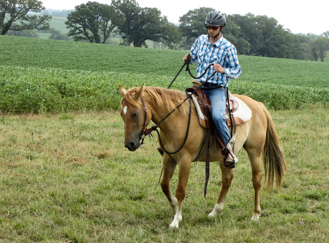 I let him go for just a second as the jump was small and I thought he might just settle himself. But he kept going. I got thrown forward and thought I might be toppling out of the saddle soon. Instead I was able to keep my seat and bring his head around in a one-rein stop. He settled down very quickly. We did a few flexes and disengages and then walked off to do some more circles and figure-eights. I was a little apprehensive, but Laredo seemed fine.