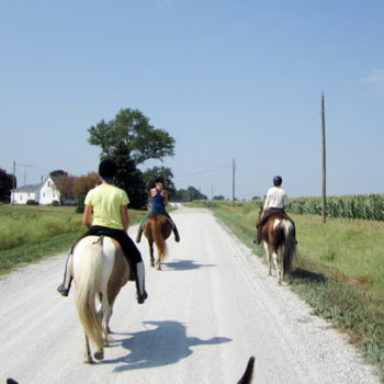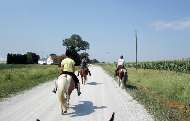 The level B road popped us out onto another quiet, gravel road and we started heading back in the direction of the barn. The horses were great, although they were getting pretty sweaty and tired. I was hoping we could get up to another section of B road, but that didn’t totally work out. We ended up following the gravel for quite a while and just chatting and enjoying the day. Finally we got to a small dirt path that angled us back to the barn.