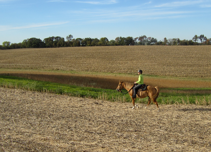 Today we went to the barn later in the day than usual, and left Steen in the pasture while we took Bear and Laredo into the newly plowed soybean field. This was a good change of pace. Laredo was perky by relaxed heading out, and I marveled at how comfortable I’m starting to feel on his back.