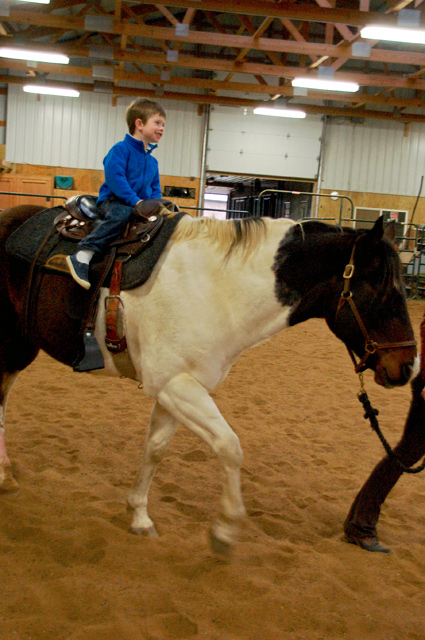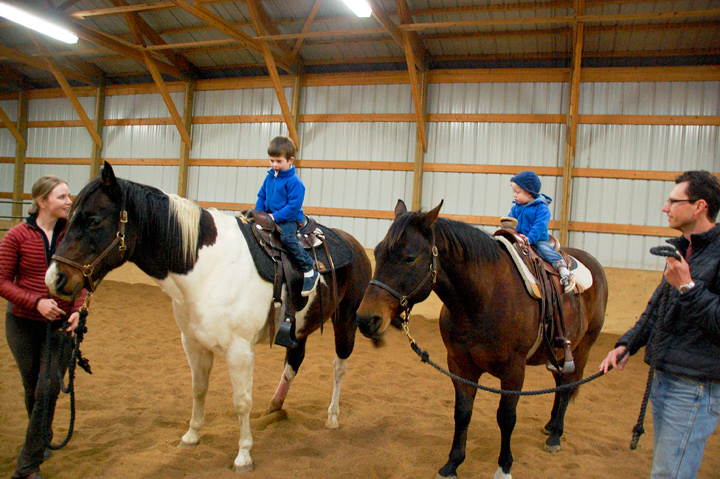 Back in the indoor arena, Noah was ready to go but Ben was hesitant. He said he didn’t want to ride, but after watching Noah aboard the placid Bear for a few minutes, he changed his mind. I put him up on Steen.