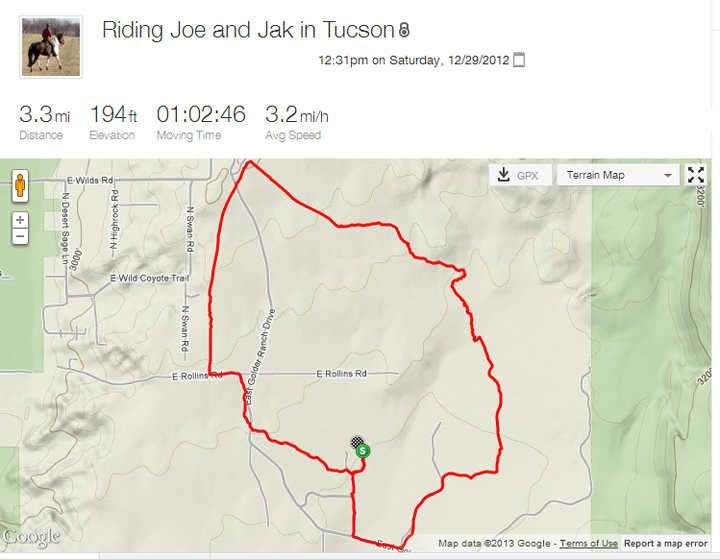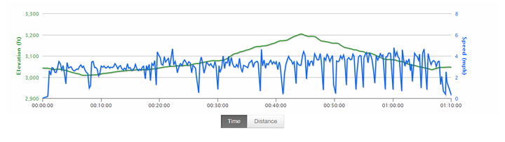 The guys did quite well. Joe can get anxious out on the trails, so I worked on steering with my legs and giving him his head. He responded by staying attentive and relatively relaxed the entire ride. At the beginning, Jak and Joe seemed inclined to move out at roughly the same pace, but by the middle Joe was pulling ahead regularly, and by the last third or so he was really wanting to walk out. He wasn’t being bad at all, but he was getting well ahead of Jak, so I was regularly stopping him to let Jak catch up. This shows on our speed chart.
