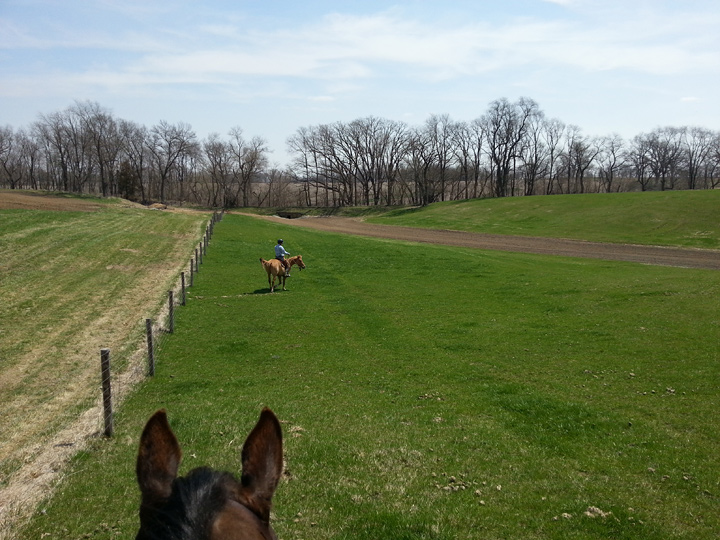This was the bulk of our ride. We moved in and out of the trot a lot, and when we were in the trot we were working on moving at the rate I wanted us to go. I can’t say Laredo was necessarily into this, but he was getting better and listening and he never got grouchy with me.