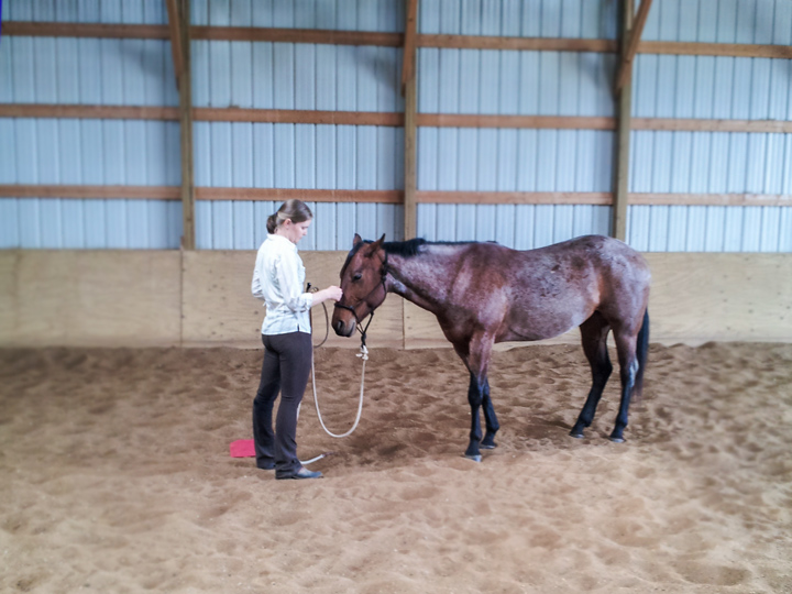 Then I brought the flag out. She didn’t flinch at all the first time I touched her with it on her left side. She did some spazzy shakes at first on the right side (she’s much more defensive on that side) but calmed down quickly. We worked on more yielding. Between every movement, I worked on softening her neck and bringing her head down. There was a lot of the commotion in the barn, but I was able to mostly keep her attention on me, and she started to show signs that she’s figuring out this is a comfortable place.