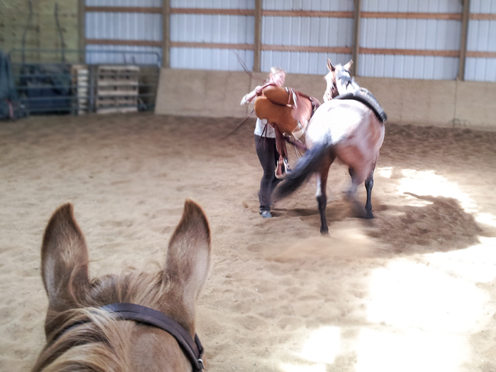 But of course he was really happy to stop. We’d lope a few laps in one direction, stop, go to the other way, stop, go the other way, etc.. The shot below was actually one of sloppiest stops (you can see he’s only stopping on one hind leg). You can see at age (almost) 4 with barely a year of consistent handling, he’s light years better at this than my seasoned saddle horse. I suppose we all have our strengths and weaknesses.