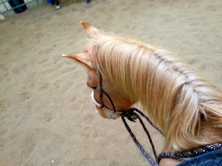 After the playing, I started to tack and groom. Chunks of snow kept sliding off the roof and falling past the windows, which would make Laredo raise his head and look concerned. There was also a noisy snowplow working outside, and another boarder chasing her horse around in the arena and clapping her hands. All of this combined into a Laredo brain overload, and he briefly forgot how to hand still. I had to do a little work to get him quieted down and able to stand quietly again.