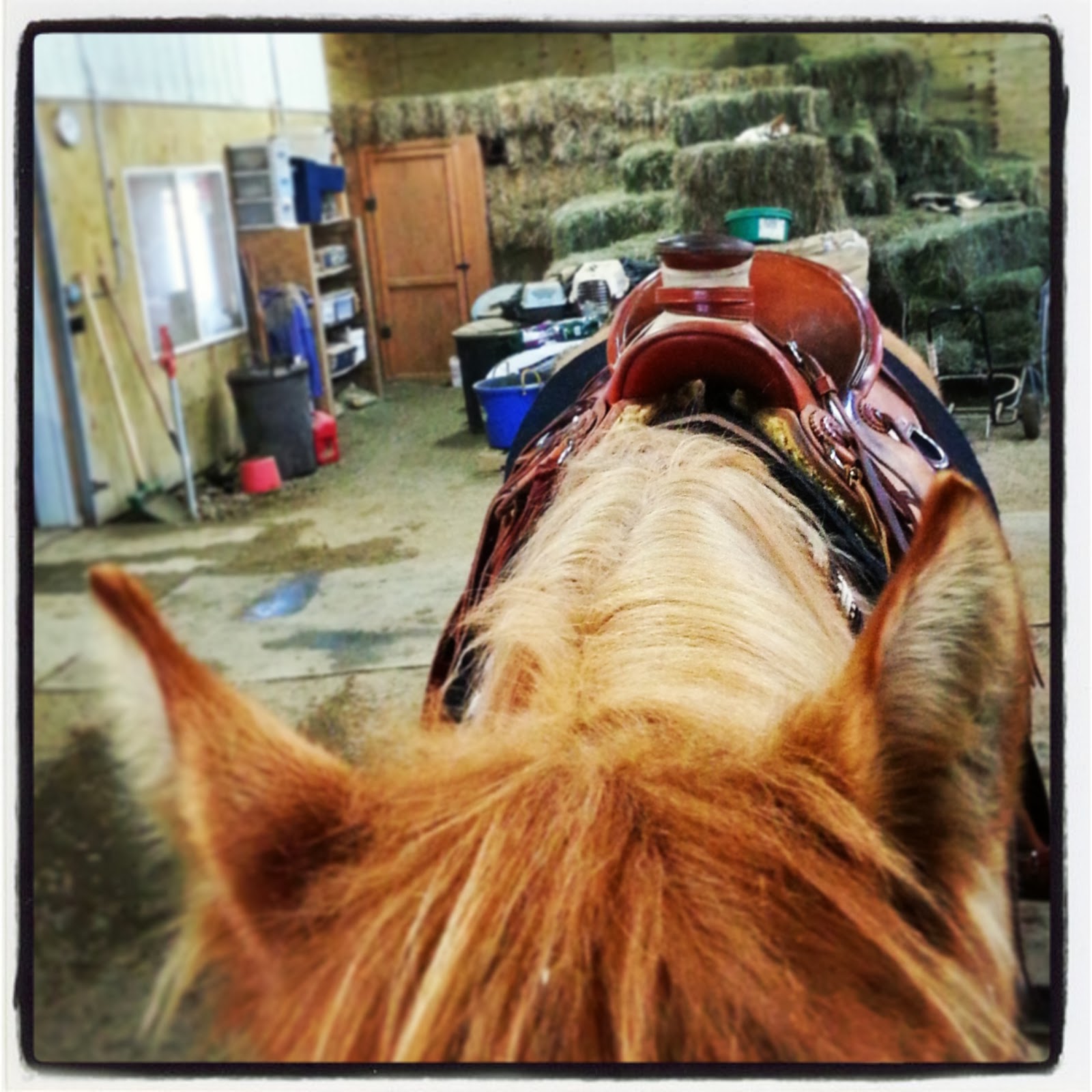 But nevertheless, it was a good ride. We were dodging lessons horses the whole time, but Laredo was unflappable. At one point the barn manager (who was on foot and chasing a beginner on a pony around with a lunge whip) looked at me after accidentally running right into my trajectory, whip flailing, and said, “I’m glad your horses are so sane. I couldn’t do this with anyone else in here.”