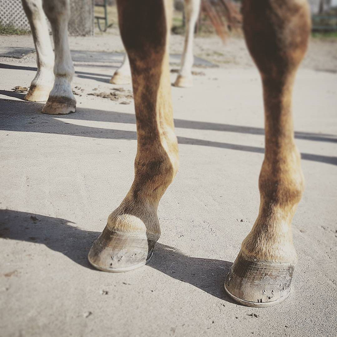 Piper’s toes with brand new shoes and Steen’s feet in the background before a trim.
